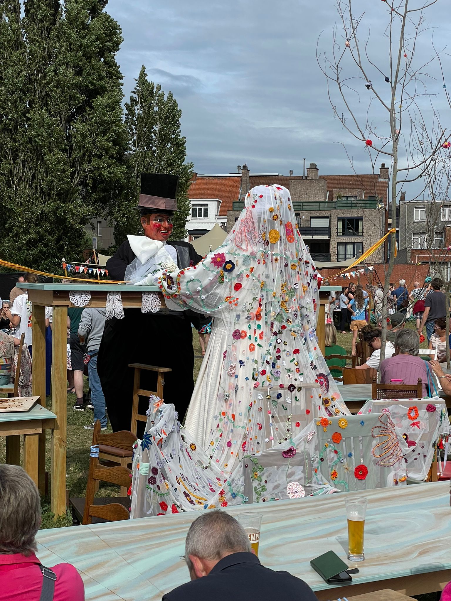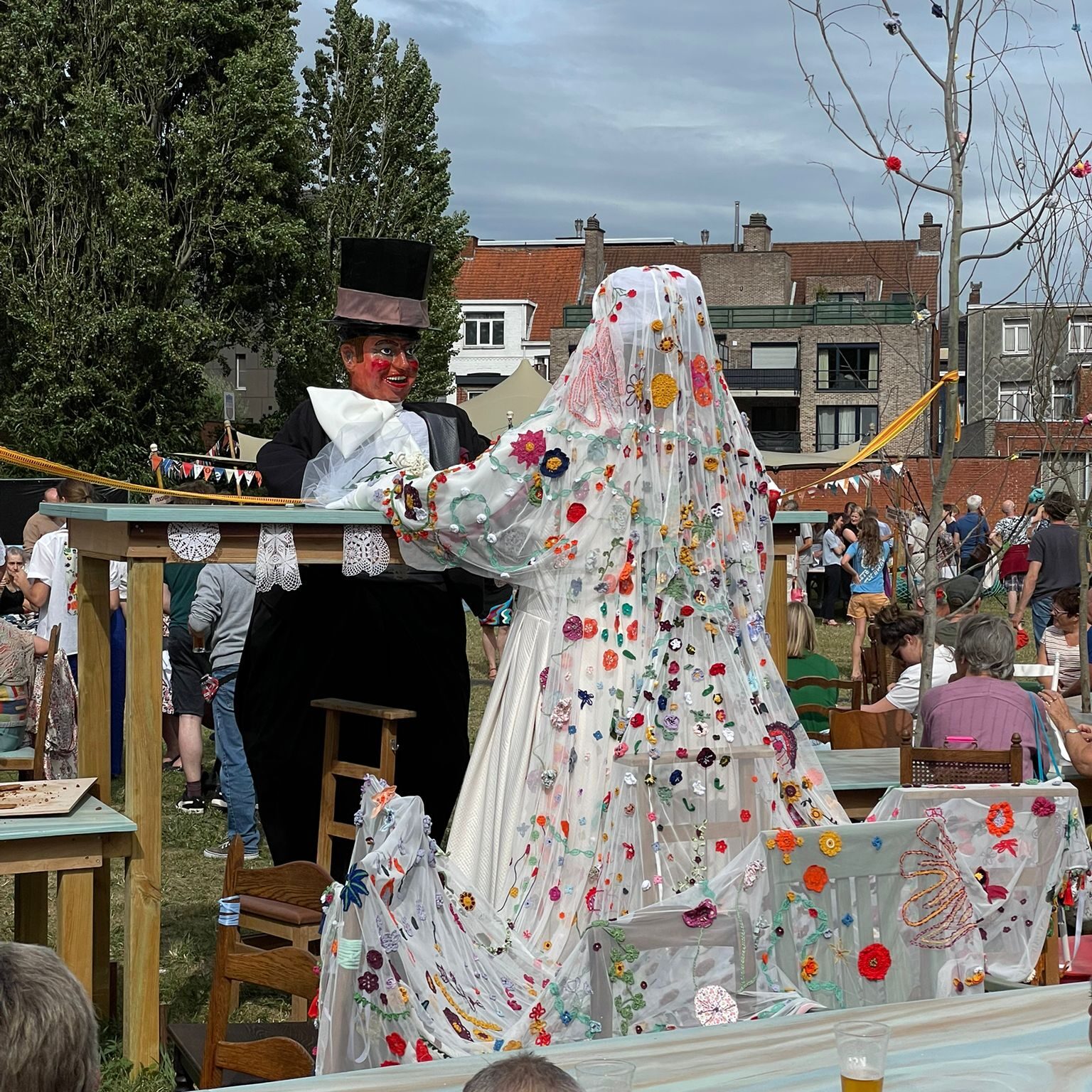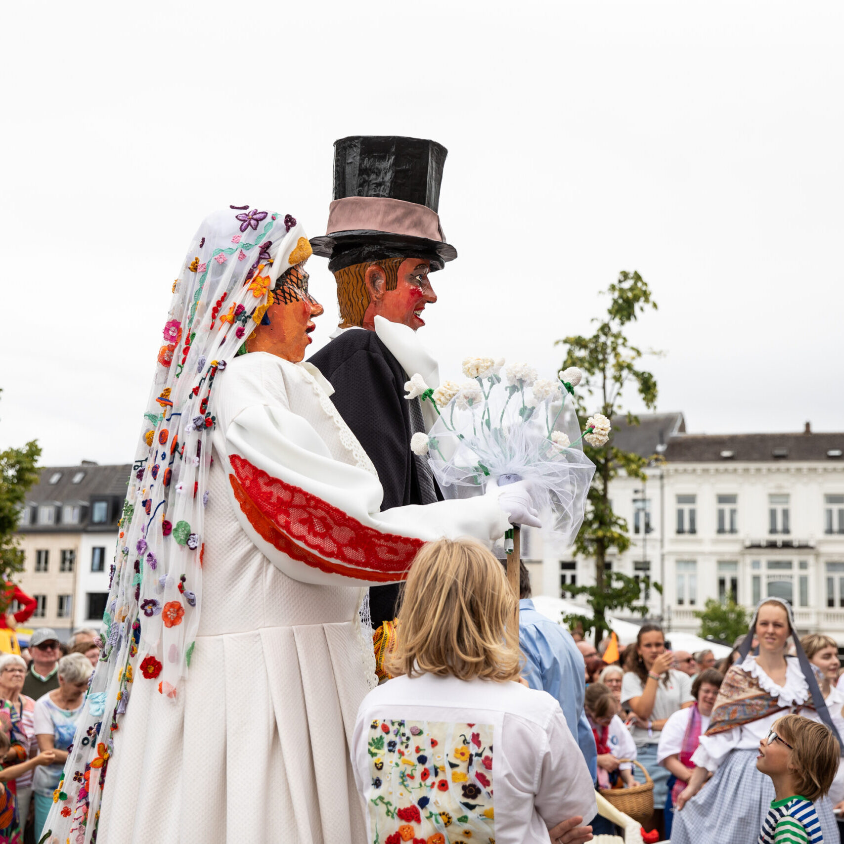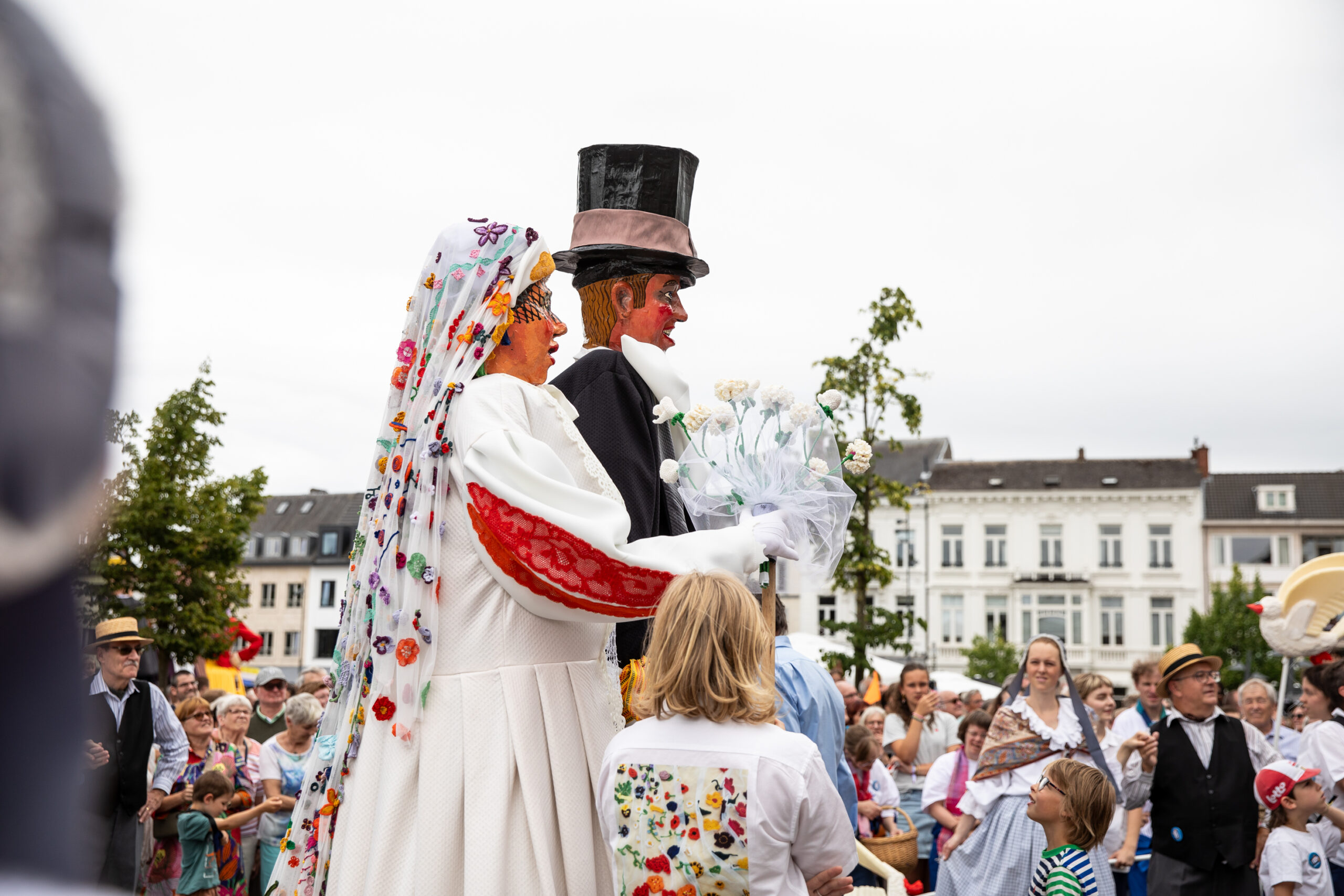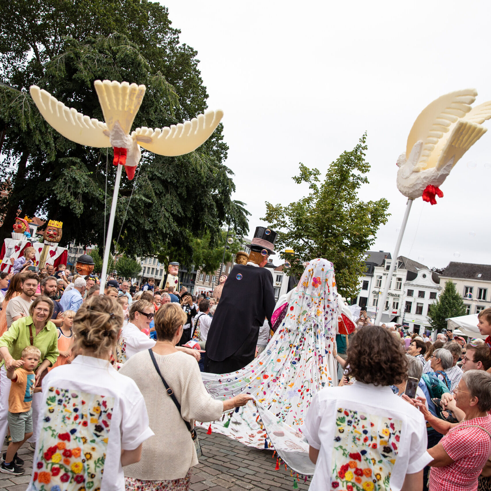 Pietje Facteur begon zijn tocht vol zenuwen aan het Speelkaartenmuseum, vergezeld door de kaartenreuzen, bevriende reuzenfamilies en de doedelzakklanken van de Lowland Pipers. Aan de Wollewei haalde hij zijn bruid Mietje Botermelk op, die straalde met haar indrukwekkende sluier. Langs de route voegden ook andere Turnhoutse reuzen zich aan bij de stoet, samen met ParadeKorps DEMO en Dansgroep Zonne, die zorgde voor de nodige ambience door dans en muziek. Onderweg deelden acteurs van Theater Stap kleurrijk gehaakte bloemen en prachtig geborduurde zakdoeken uit.