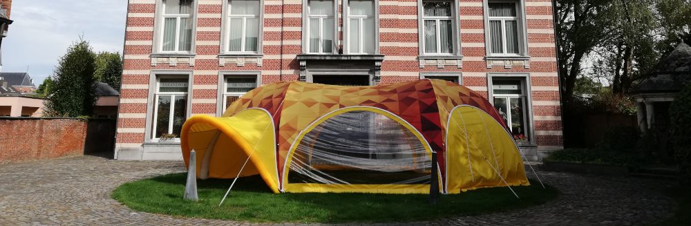 In deze coronatijden kun je niet voorzichtig genoeg zijn als organisator. De regels voor wat mag en niet mag veranderen om de haverklap. Wat je buiten mag is niet hetzelfde als binnen. Maar een grote tent die eigenlijk als een weerbestendig afdak kan dienen, waarvan alle zijkanten open kunnen worden gezet of naar keuze aan één kant open kan worden gelaten: dat bood ons inziens wel wat mogelijkheden. Op voorwaarde dat ze gemakkelijk opgezet kon worden en dat ze er een beetje goed uitzag. Omdat we alvast heel wat cursusdagen voorzagen voor ons project Collectieve Collectie, togen we aan het werk. Met een vectorieel bestandje in de juiste kleuren, lieten we een tentenbouwer een ontwerp maken op basis van de HEXA44 tent. Het resultaat kunt u momenteel gaan bewonderen in de voortuin van het Taxandria Museum in Turnhout. En het goeie is: u kunt ze bij ons ook ontlenen onder bepaalde voorwaarden.